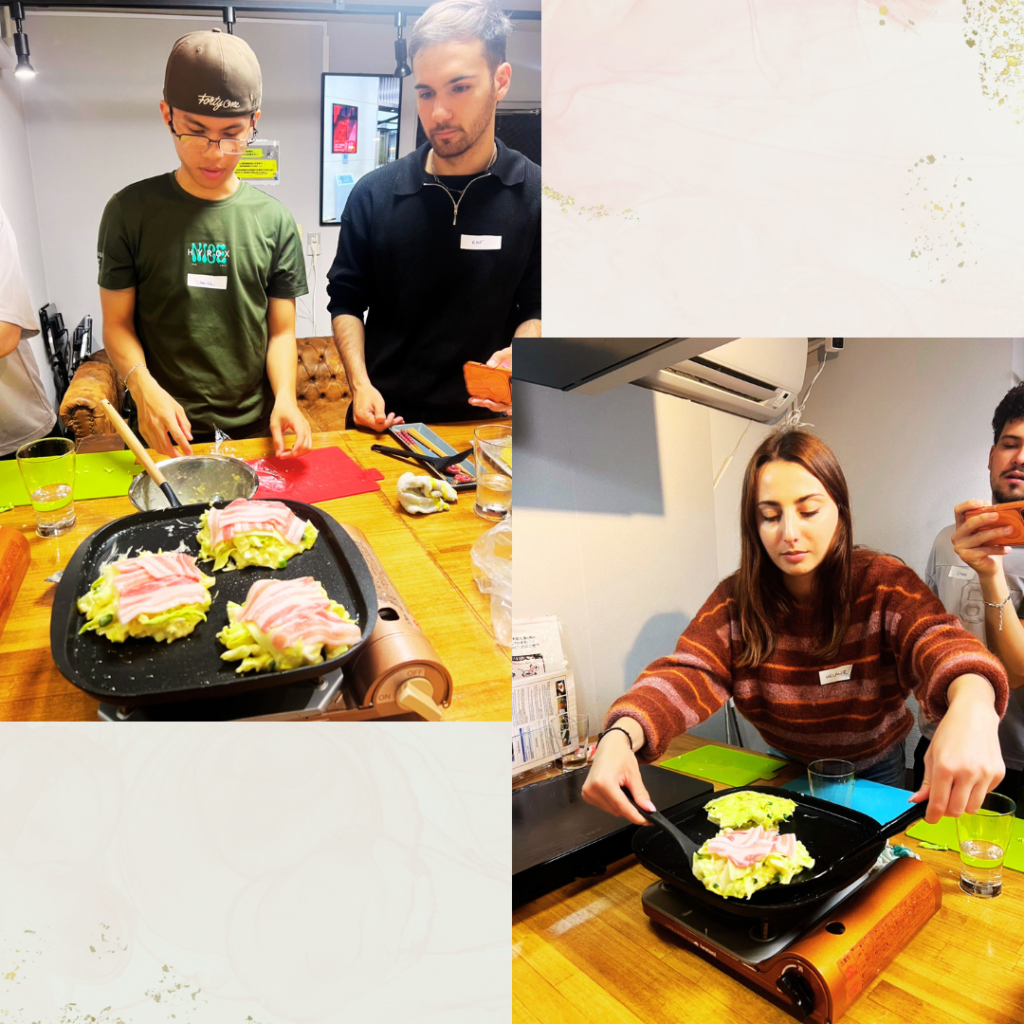 They have been staying in Japan for two weeks and had already tried okonomiyaki in Osaka. This time, they made it from scratch in our class. The final result turned out great!